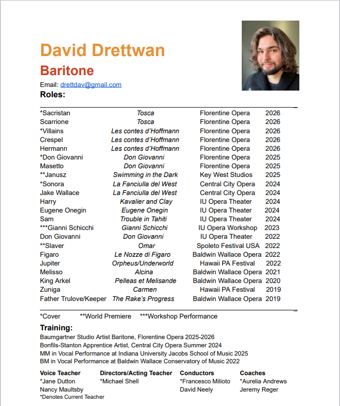 David Drettwan is a 25 year old baritone hailing from Elkhorn, Wisconsin. He is the baritone in the 2025-26 Baumgartner studio artist program at Florentine Opera in Milwaukee, where he will be singing the roles of Masetto (Don Giovanni), Crespel (Les Contes d’Hoffmann), and Sciarrone (Tosca) this season. He made his professional debut in the 2022 world-premiere of the Pulitzer Prize-winning new opera Omar by Rhiannon Giddens and Michael Abels at Spoleto Festival USA in Charleston, SC. He was an apprentice artist at Central City Opera in 2024 singing Jake Wallace in La Fanciulla del West by Puccini. Past collegiate roles include Eugene Onegin (Eugene Onegin), Don Giovanni (Don Giovanni), Figaro (Le Nozze di Figaro), Harry (The Amazing Adventures of Kavalier and Clay), King Arkel (Pelléas et Melisande), Sam (Trouble in Tahiti), Melisso (Alcina), and Keeper/Father Trulove (The Rake’s Progress), as well as workshop performances of Gianni Schicchi (Gianni Schicchi) and a new opera by Martin Hennessey titled Swimming in the Dark as Janusz at Key West studios..
